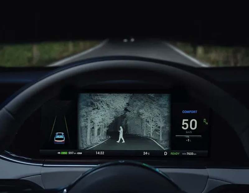 Οδηγήστε με ασφάλεια στο σκοτάδι, ακόμα και σε σημεία με κακό φωτισμό και ελάχιστη ορατότητα. Το σύστημα Night Vision του VOYAH FREE εντοπίζει πεζούς, ζώα και άλλα εμπόδια στο δρόμο πολύ πριν τα αντιληφθεί ο οδηγός και τα προβάλλει στον ψηφιακό πίνακα οργάνων, προειδοποιώντας εγκαίρως για πιθανούς κινδύνους.